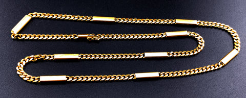 This modern chain has curb links and flat, polished stations in regular increments along its length. A beautiful halo of gold to wear by itself, layered with other chains, and it also has a small enough clasp to run it through a pendant bale. The perfect piece to add a gleam to all of your ensembles!