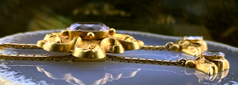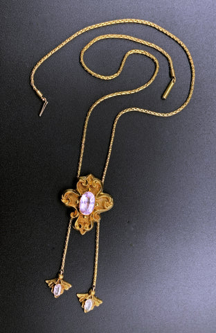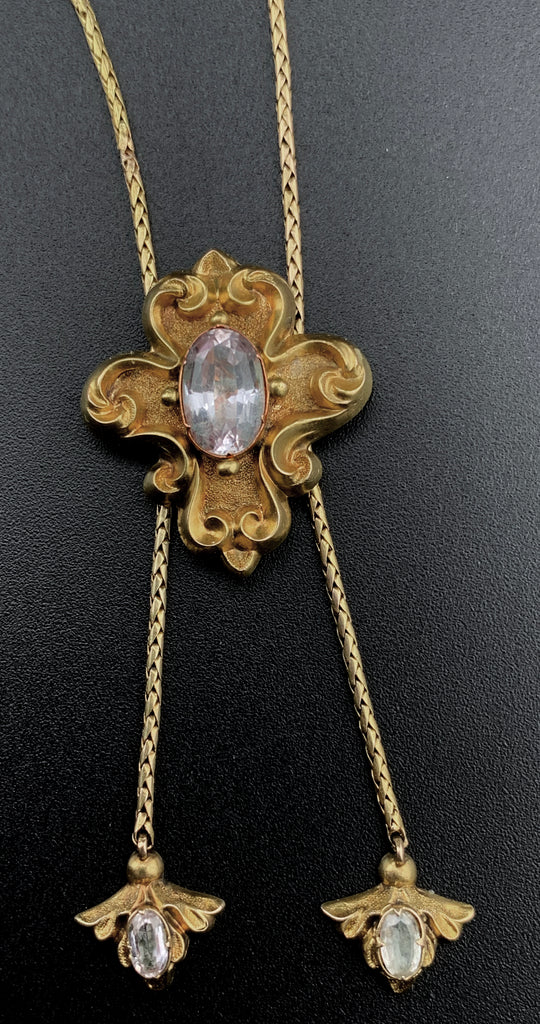 Elegant and artistic, this style of necklace is also referred to as a lariat. The pendant can slide up or down on the rope chain to suit the wearer. Crafted in rich 18 karat yellow gold, it has a stylized Rococo pendant with a large spinel in the center. Two caps on the chain ends are topaz set in whimsical frames that remind us of little insects or leaves. On the reverse, a small locket holds woven hairwork under glass, a tiny portal reminding us of the original owner. A wonderful piece, with plenty of versatility and flash and sure to become your signature piece!