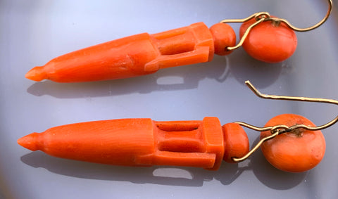 Beautiful, bright orange coral has been carved into amphora vessels, with cabochons at the top, and 10 karat yellow gold hooks. Perfectly executed with skill and precision, they will have everyone commenting when you wear them!