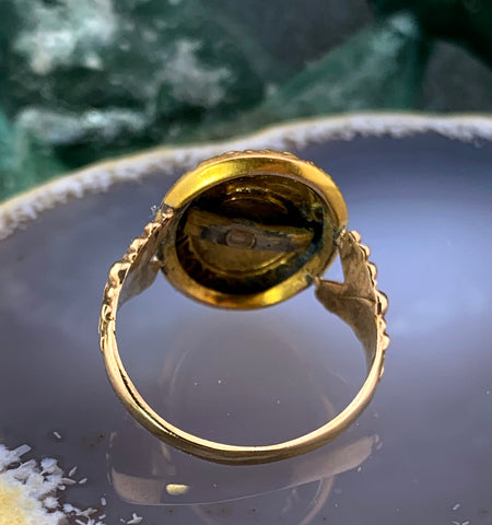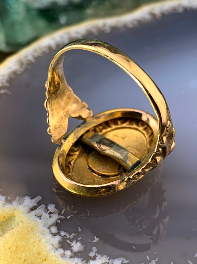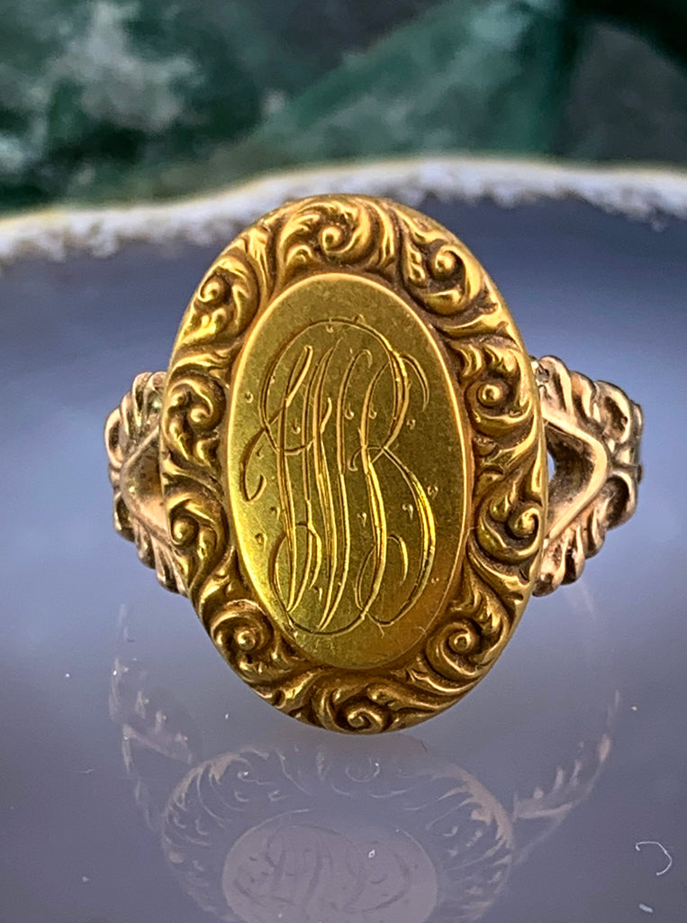 Converted from an antique cufflink using a replica shank, this ring is entirely 14 karat yellow gold. The stylized monogram is rather difficult to decipher, but the letter 'B' is readily apparent. Beautifully paired with its shank, it's a great piece for anyone who sports a 'B' name!