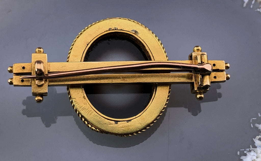 Crafted in 15 karat yellow gold with black enamel and seed pearl accents, this piece has an elongated plate and would have been worn at the collar of a lady's blouse or cloak.