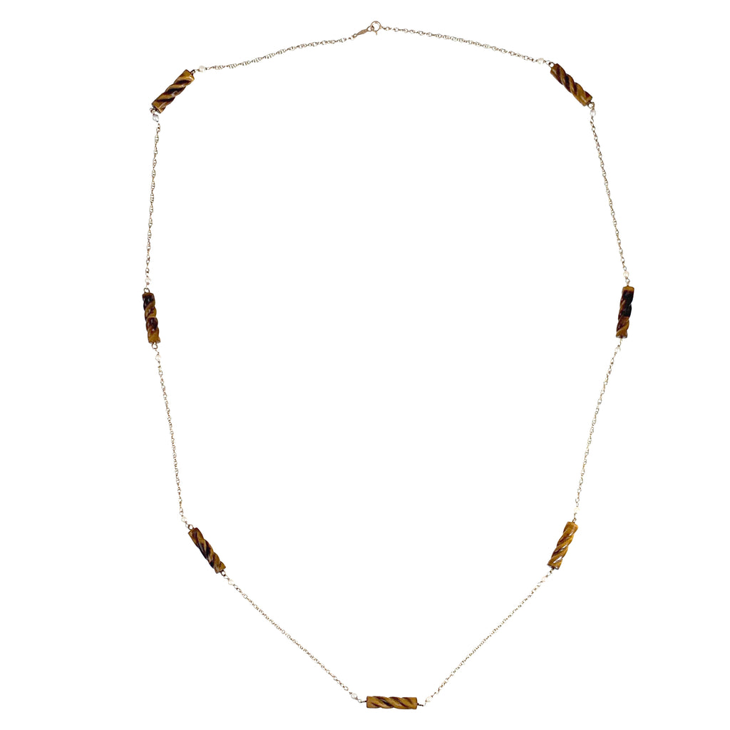 This vintage 1970s spacer chain has 7 barley-corn carved Tigers Eye spacers, accented with 14 creamy pearls. A great piece to loop, layer or wear loose, she's the kind of classy and casual girl you can't resist!