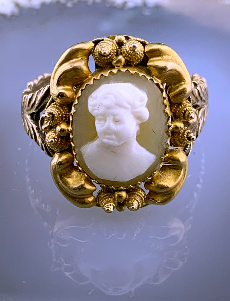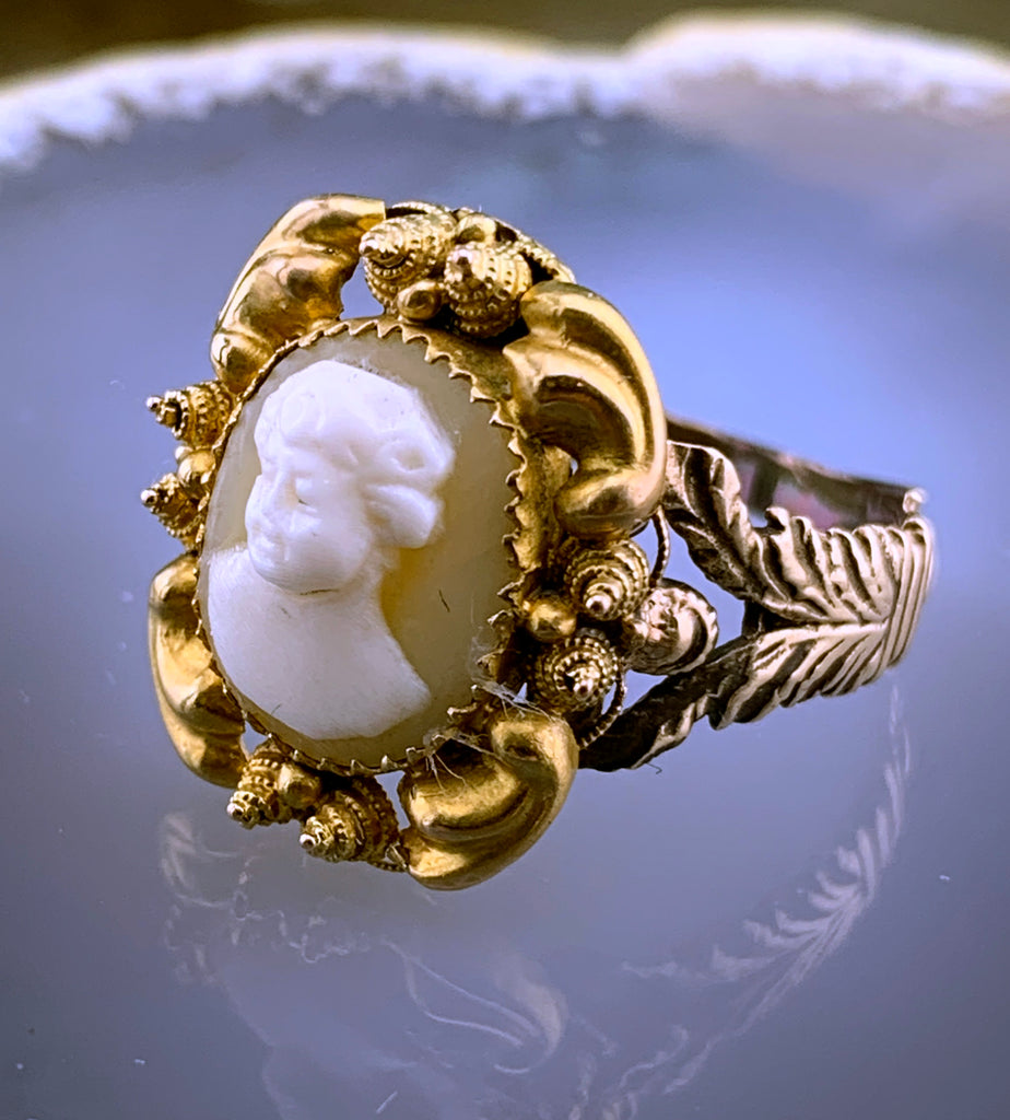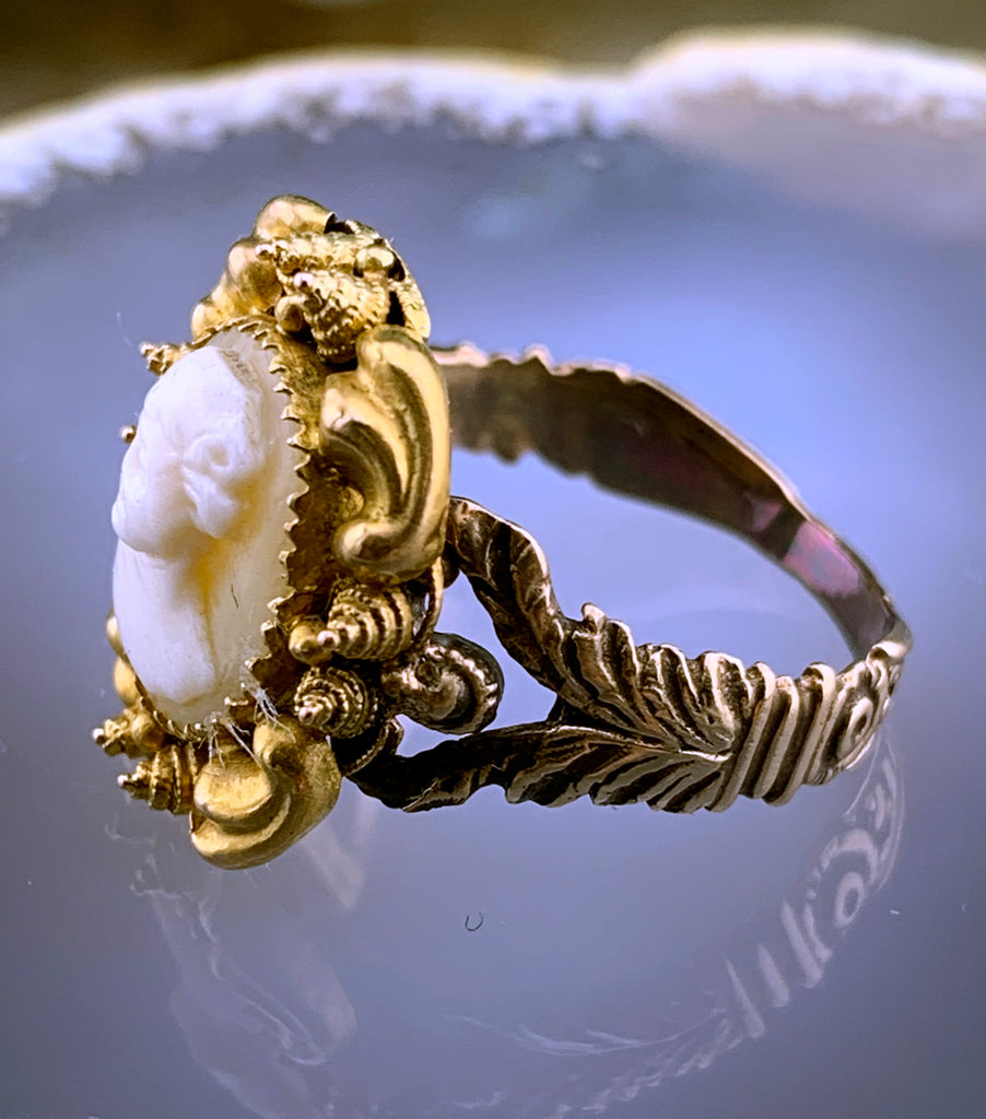 Converted from an antique stickpin, this wonderful cameo ring features the carving of a young boy, perhaps meant to depict a god or figure in mythology. His little grin and sprite-like tilt of the head make us think of Shakespeare's Puck from a Midsummer Night's Dream. Elaborately framed in 18 karat gold with cannetille work and perfectly paired with one of our antique replica shanks, he is sure to cast his glamour on you and enchant everyone who meets him!